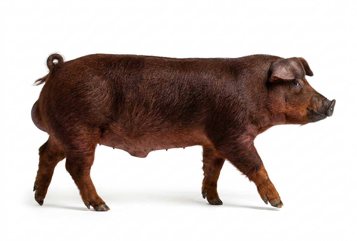 Дюрок имеет плодовитость 8–10 поросят, высокий среднесуточный привес 850–950 г и мясность 55–60%. Главная особенность — мраморная структура мяса, которая повышает его рыночную стоимость. В результате дюрок часто используется как завершающая линия в гибридных схемах.